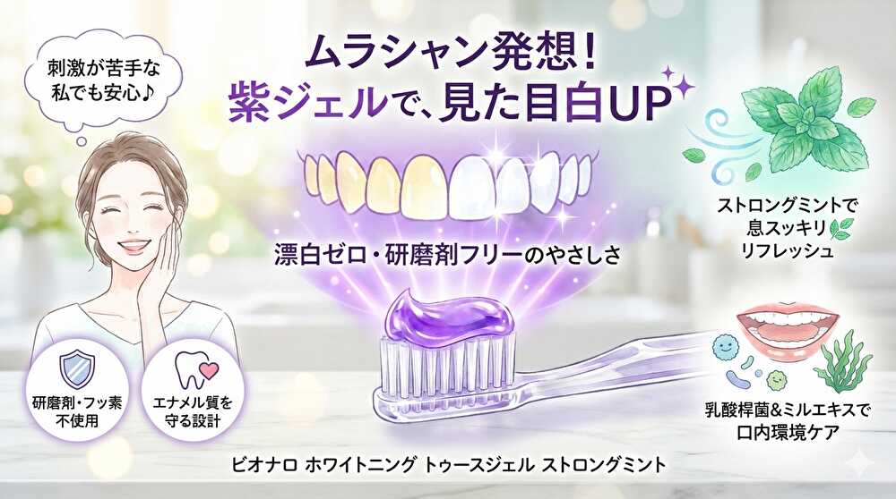 「ビオナロ ホワイトニング トゥースジェル ストロングミント」は、紫の補色効果で黄ばみを中和し、磨いた直後から白く見えるという新しいタイプのホワイトニングジェル。